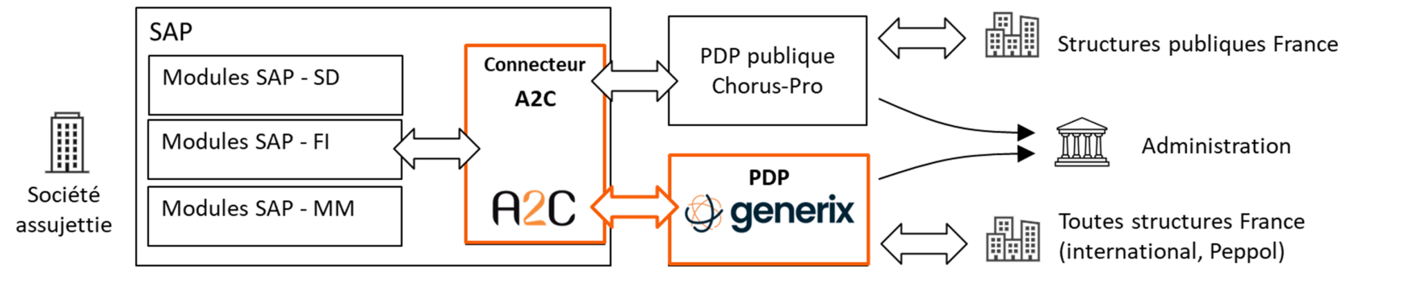 A2C se positionne en tant que concentrateur dans SAP des échanges avec les différents acteurs de la facturation électronique et permet notamment de simplifier l’interfaçage des PDP avec les solutions SAP ECC6 et SAP S/4HANA (On Premise et RISE). A2C permet de bénéficier d’une vision centralisée, dans SAP, des flux de factures clients et fournisseurs et de disposer d’une forte indépendance vis-à-vis des PDP (il est possible d’avoir plusieurs PDP et vous pouvez en changer plus facilement).