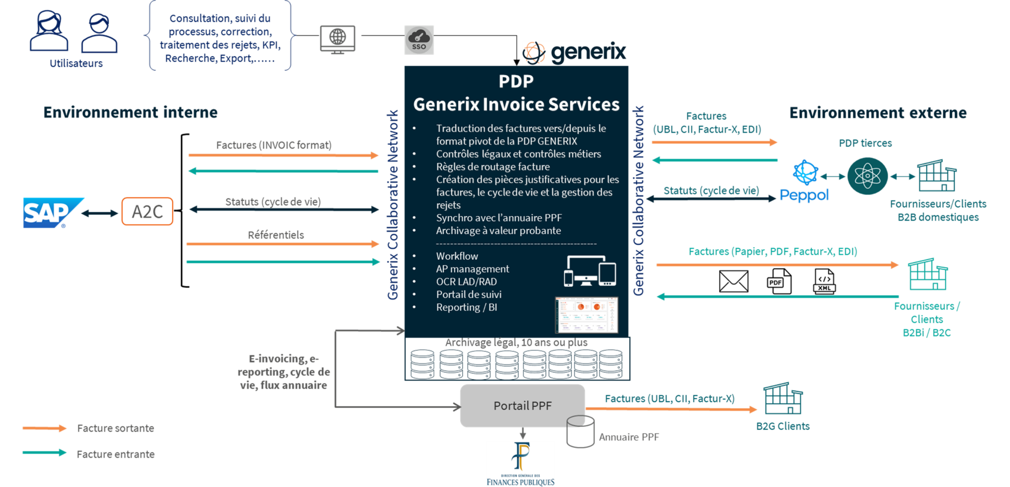 A2C se positionne en tant que concentrateur dans SAP des échanges avec les différents acteurs de la facturation électronique et propose une solution standard d’interfaçage de la PDP Generix avec les solutions SAP ECC6 et SAP S/4HANA (On Premise et RISE).