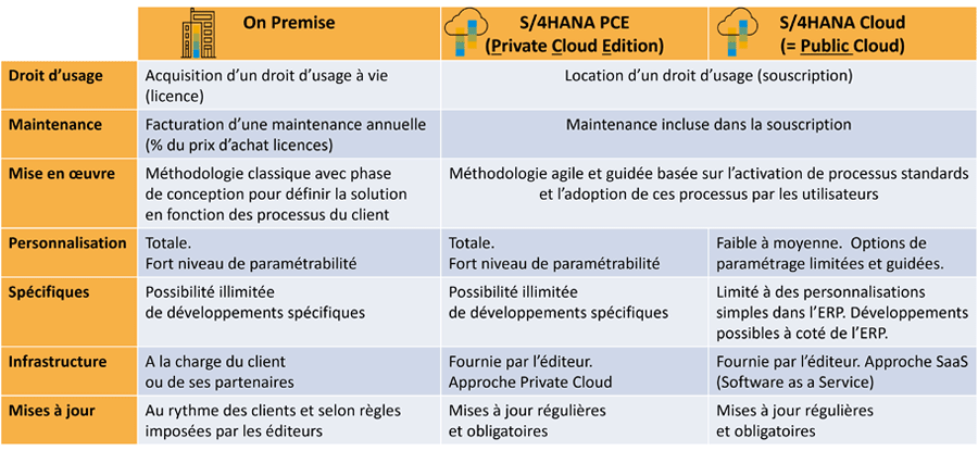 Voici, en synthèse, les principales différences entre les offres S/4HANA ON Premise, Private Cloud et Publice Cloud :