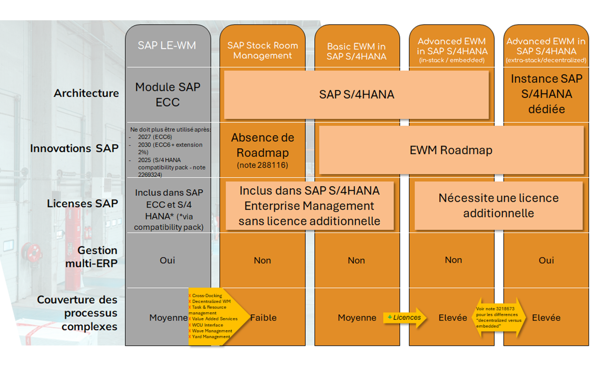 Dans le cadre d’une transition vers S/4HANA, le déploiement de SAP EWM est ainsi plus judicieux grâce à sa couverture fonctionnelle plus étendue et car l’absence de roadmap sur SAP Stock Room Management offre des perspectives à long termes moins intéressantes (voir note OSS 288116).