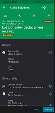 - Navigation pour se rendre sur le lieu d’intervention : client ou localisation de l’équipement.