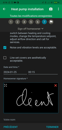 Confirmation des temps par le collaborateur , informations du questionnaire et signature client :