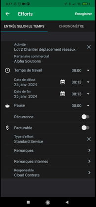 - Saisie des temps passés : temps de trajet, temps effectif d’intervention
