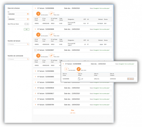 - Recherche de factures par période ou par numéro de facture (toutes les factures concernant le fournisseur, y compris celles non envoyées via le portail)
